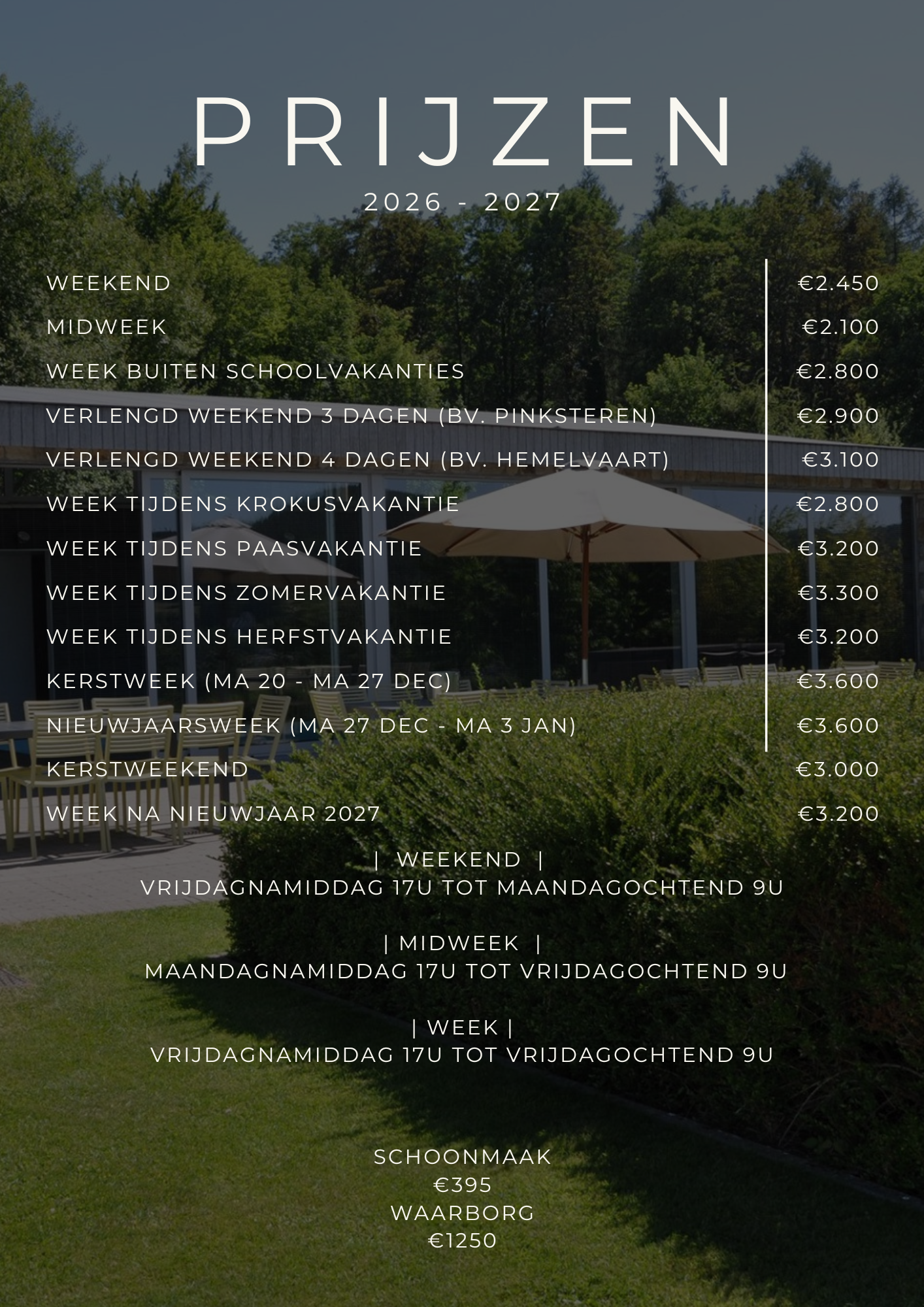 Tijdens de schoolvakanties (Krokusvakantie, Paasvakantie, Zomervakantie in juli en augustus, Herfstvakantie en Kerstvakantie) is de woning enkel per volledige week te huur!